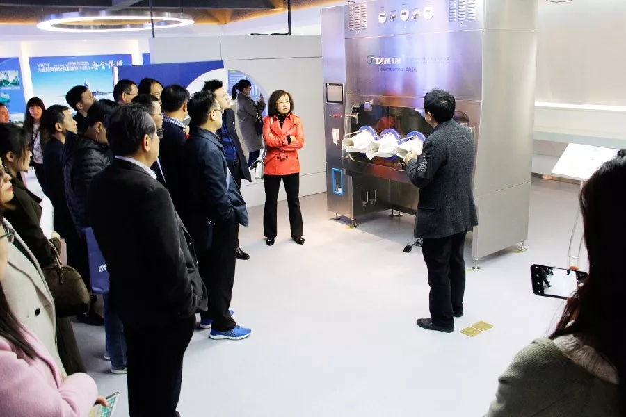 來訪領(lǐng)導(dǎo)專家首先參觀了泰林生物科技展廳,全面地了解了泰林生物的發(fā)展現(xiàn)狀,醫(yī)藥行業(yè)領(lǐng)導(dǎo)對無菌隔離器系統(tǒng)、過氧化氫滅菌器、微生物檢測系統(tǒng)及TOC分析儀等泰林核心產(chǎn)品產(chǎn)生了極大的興趣。參觀的同時也對產(chǎn)品的操作過程及性能特點展開了討論,充分肯定了泰林生物的科研技術(shù)及成果。