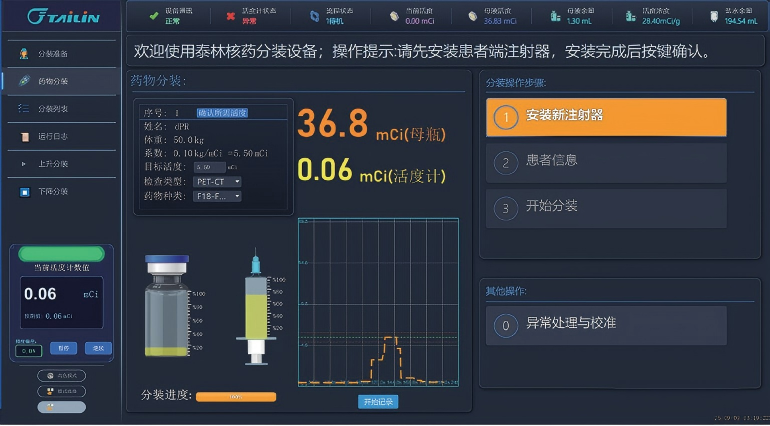 泰林正電子藥物分裝機具有自動分裝核藥功能,能根據(jù)臨床需求活度劑量將母液分裝至注射器,尤其適合正電子藥物分裝。